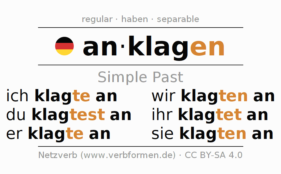The conjugation of anklagen (accuse, charge) in the past tense is ich klagte an, du klagtest an, er klagte an, wir klagten an, ihr klagtet an, sie klagten an. As a regular verb the unmodified stem klag- is used. The preterite endings -te, -test, -te, -ten, -tet, -ten are appended to this stem.The prefix an- of anklagen is separated.The conjugation of these forms conforms to the grammatical rules for verbs in the past tense. Comments ☆