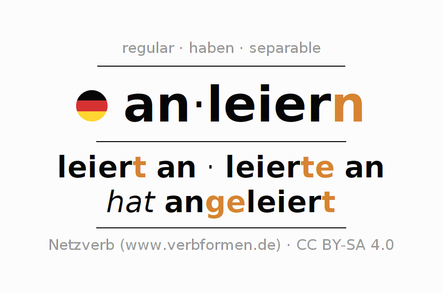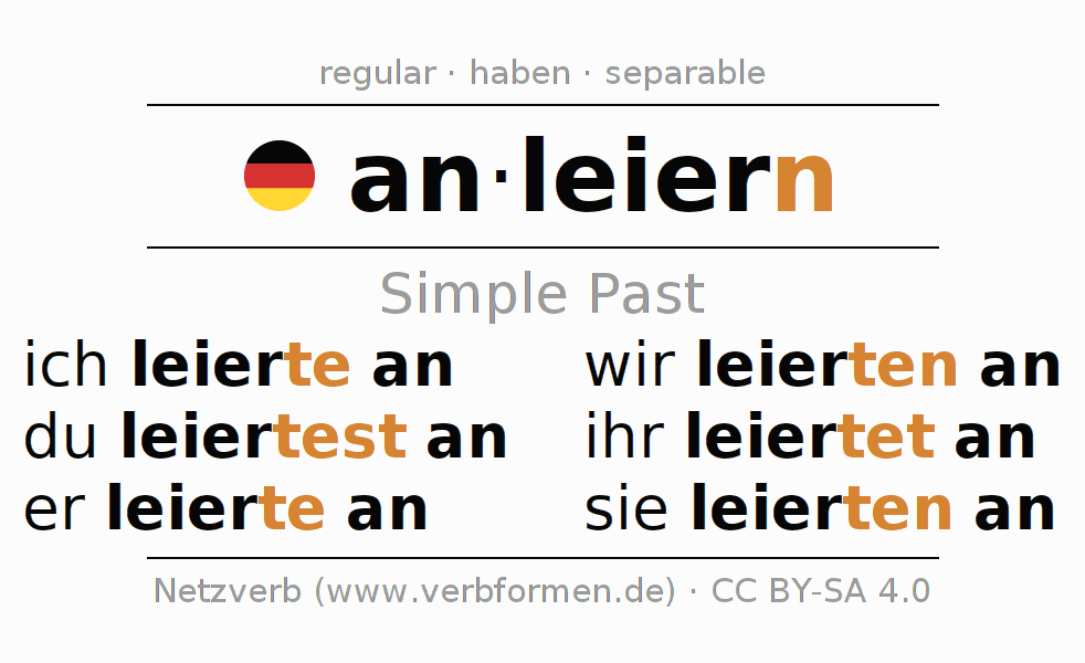 The conjugation of anleiern (get going, initiate) in the past tense is ich leierte an, du leiertest an, er leierte an, wir leierten an, ihr leiertet an, sie leierten an. As a regular verb the unmodified stem leier- is used. The preterite endings -te, -test, -te, -ten, -tet, -ten are appended to this stem.The prefix an- of anleiern is separated.The conjugation of these forms conforms to the grammatical rules for verbs in the past tense. Comments ☆