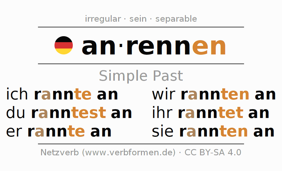 The conjugation of anrennen (attack, charge) in the past tense is ich rannte an, du ranntest an, er rannte an, wir rannten an, ihr ranntet an, sie rannten an. As an irregular verb is the changed preterite stem rann- used. The preterite endings -te, -test, -te, -ten, -tet, -ten are appended to this stem.The prefix an- of anrennen is separated.The conjugation of these forms conforms to the grammatical rules for verbs in the past tense. Comments ☆