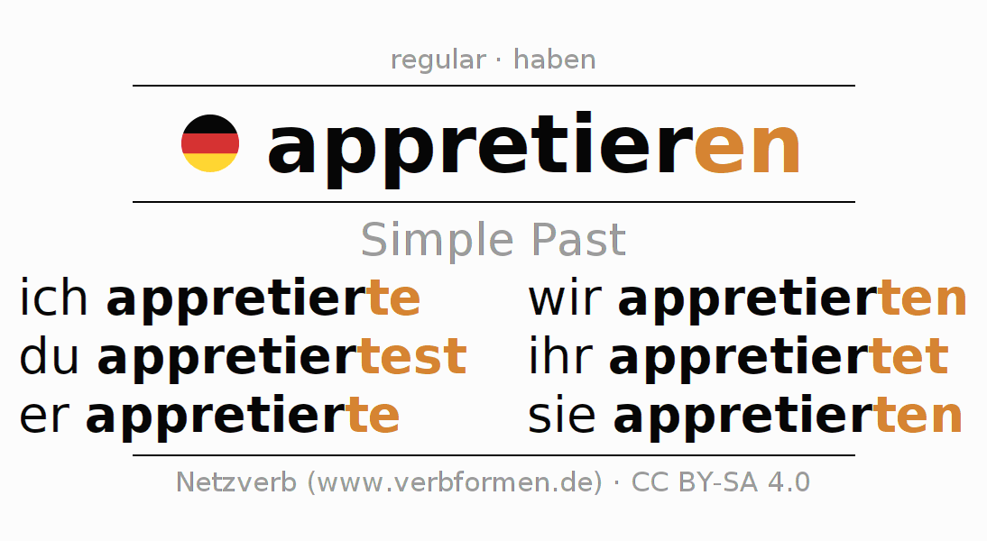 The conjugation of appretieren (finish, dress) in the past tense is ich appretierte, du appretiertest, er appretierte, wir appretierten, ihr appretiertet, sie appretierten. As a regular verb the unmodified stem appretier- is used. The preterite endings -te, -test, -te, -ten, -tet, -ten are appended to this stem.The conjugation of these forms conforms to the grammatical rules for verbs in the past tense. Comments ☆