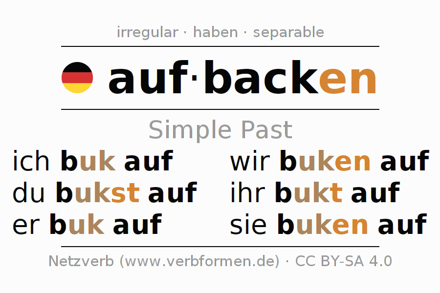 The conjugation of aufbacken (reheat, bake again) in the past tense is ich buk auf, du bukst auf, er buk auf, wir buken auf, ihr bukt auf, sie buken auf. As an irregular, strong verb with ablaut -u- the preterite stem buk- is used. The preterite endings -st, -en, -t, -en are appended to this stem. The 1st and 3rd person singular have no endings.The prefix auf- of aufbacken is separated.The conjugation of these forms conforms to the grammatical rules for verbs in the past tense. Comments ☆
