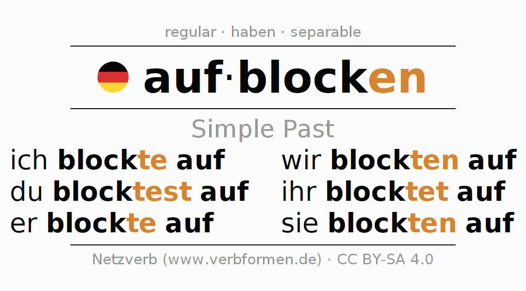 The conjugation of aufblocken (block) in the past tense is ich blockte auf, du blocktest auf, er blockte auf, wir blockten auf, ihr blocktet auf, sie blockten auf. As a regular verb the unmodified stem block- is used. The preterite endings -te, -test, -te, -ten, -tet, -ten are appended to this stem.The prefix auf- of aufblocken is separated.The conjugation of these forms conforms to the grammatical rules for verbs in the past tense. Comments ☆