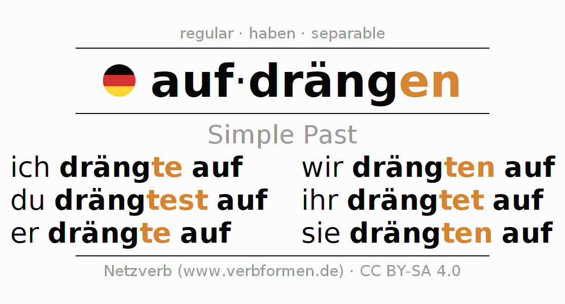 The conjugation of aufdrängen (force on, impose) in the past tense is ich drängte auf, du drängtest auf, er drängte auf, wir drängten auf, ihr drängtet auf, sie drängten auf. As a regular verb the unmodified stem dräng- is used. The preterite endings -te, -test, -te, -ten, -tet, -ten are appended to this stem.The prefix auf- of aufdrängen is separated.The conjugation of these forms conforms to the grammatical rules for verbs in the past tense. Comments ☆
