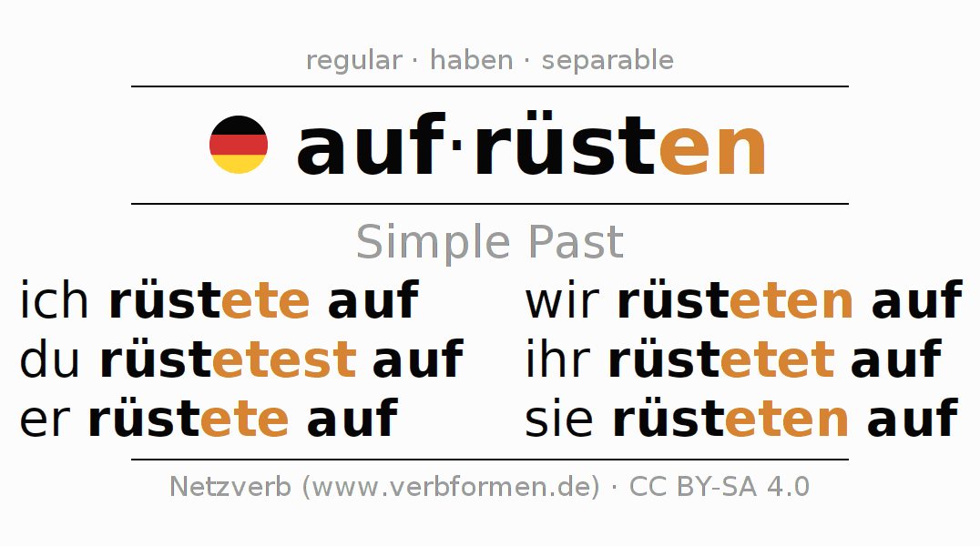 The conjugation of aufrüsten (upgrade, arm) in the past tense is ich rüstete auf, du rüstetest auf, er rüstete auf, wir rüsteten auf, ihr rüstetet auf, sie rüsteten auf. As a regular verb the unmodified stem rüst- is used. The preterite endings -ete, -etest, -ete, -eten, -etet, -eten are appended to this stem.The endings are extended by "e", as the stem ends on -t.The prefix auf- of aufrüsten is separated.The conjugation of these forms conforms to the grammatical rules for verbs in the past tense. Comments ☆