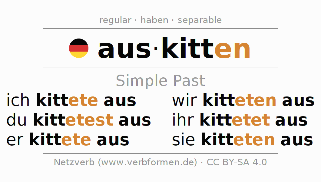 The conjugation of auskitten (plug, stop with putty) in the past tense is ich kittete aus, du kittetest aus, er kittete aus, wir kitteten aus, ihr kittetet aus, sie kitteten aus. As a regular verb the unmodified stem kitt- is used. The preterite endings -ete, -etest, -ete, -eten, -etet, -eten are appended to this stem.The endings are extended by "e", as the stem ends on -t.The prefix aus- of auskitten is separated.The conjugation of these forms conforms to the grammatical rules for verbs in the past tense. Comments ☆