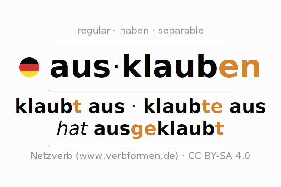 The conjugation of ausklauben (pick out, select painstakingly) in the past tense is ich klaubte aus, du klaubtest aus, er klaubte aus, wir klaubten aus, ihr klaubtet aus, sie klaubten aus. As a regular verb the unmodified stem klaub- is used. The preterite endings -te, -test, -te, -ten, -tet, -ten are appended to this stem.The prefix aus- of ausklauben is separated.The conjugation of these forms conforms to the grammatical rules for verbs in the past tense. Comments ☆