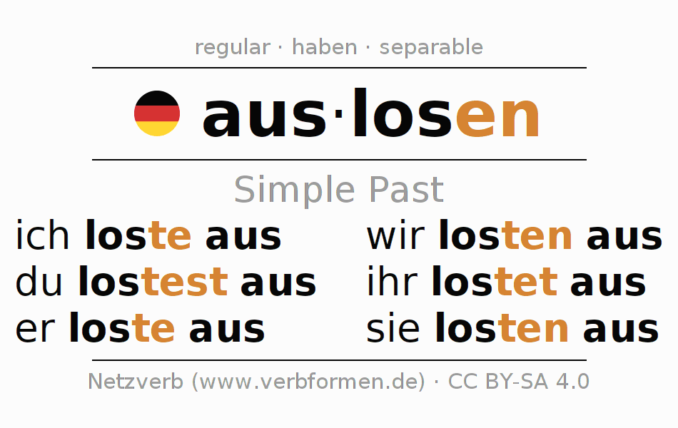 The conjugation of auslosen (draw, determine by chance) in the past tense is ich loste aus, du lostest aus, er loste aus, wir losten aus, ihr lostet aus, sie losten aus. As a regular verb the unmodified stem los- is used. The preterite endings -te, -test, -te, -ten, -tet, -ten are appended to this stem.The prefix aus- of auslosen is separated.The conjugation of these forms conforms to the grammatical rules for verbs in the past tense. Comments ☆