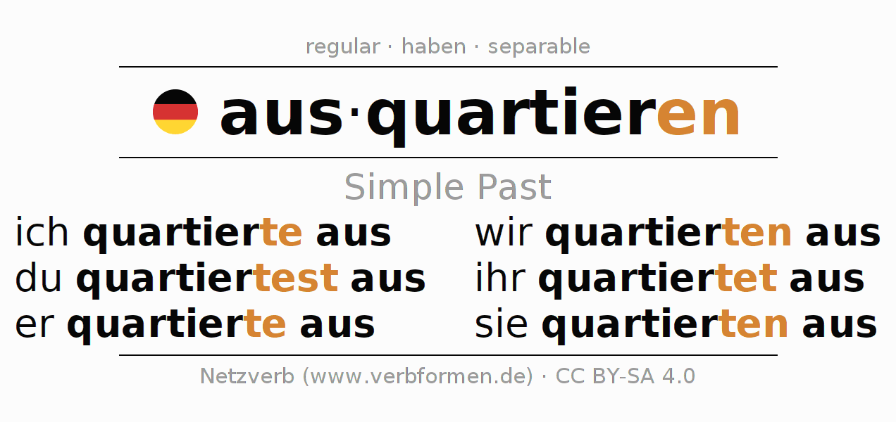 The conjugation of ausquartieren (billet out, dislodge) in the past tense is ich quartierte aus, du quartiertest aus, er quartierte aus, wir quartierten aus, ihr quartiertet aus, sie quartierten aus. As a regular verb the unmodified stem quartier- is used. The preterite endings -te, -test, -te, -ten, -tet, -ten are appended to this stem.The prefix aus- of ausquartieren is separated.The conjugation of these forms conforms to the grammatical rules for verbs in the past tense. Comments ☆