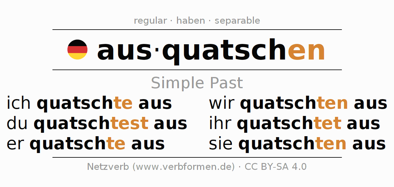 The conjugation of ausquatschen (blab, blab out) in the past tense is ich quatschte aus, du quatschtest aus, er quatschte aus, wir quatschten aus, ihr quatschtet aus, sie quatschten aus. As a regular verb the unmodified stem quatsch- is used. The preterite endings -te, -test, -te, -ten, -tet, -ten are appended to this stem.The prefix aus- of ausquatschen is separated.The conjugation of these forms conforms to the grammatical rules for verbs in the past tense. Comments ☆
