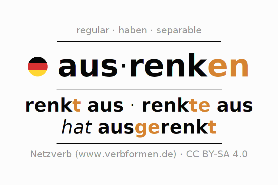 The conjugation of ausrenken (dislocate, disarticulate) in the past tense is ich renkte aus, du renktest aus, er renkte aus, wir renkten aus, ihr renktet aus, sie renkten aus. As a regular verb the unmodified stem renk- is used. The preterite endings -te, -test, -te, -ten, -tet, -ten are appended to this stem.The prefix aus- of ausrenken is separated.The conjugation of these forms conforms to the grammatical rules for verbs in the past tense. Comments ☆
