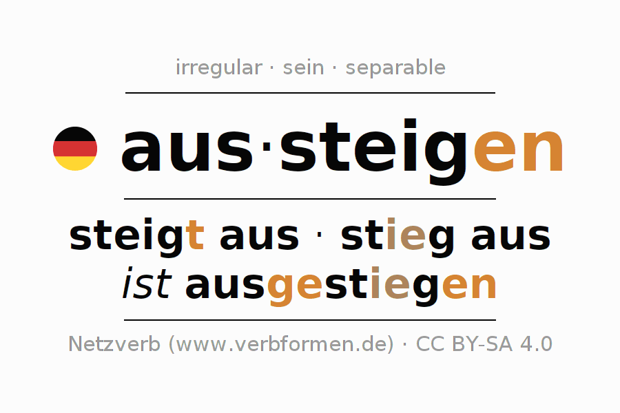 The conjugation of aussteigen (exit, drop out) in the past tense is ich stieg aus, du stiegst aus, er stieg aus, wir stiegen aus, ihr stiegt aus, sie stiegen aus. As an irregular, strong verb with ablaut -ie- the preterite stem stieg- is used. The preterite endings -st, -en, -t, -en are appended to this stem. The 1st and 3rd person singular have no endings.The prefix aus- of aussteigen is separated.The conjugation of these forms conforms to the grammatical rules for verbs in the past tense. Comments ☆