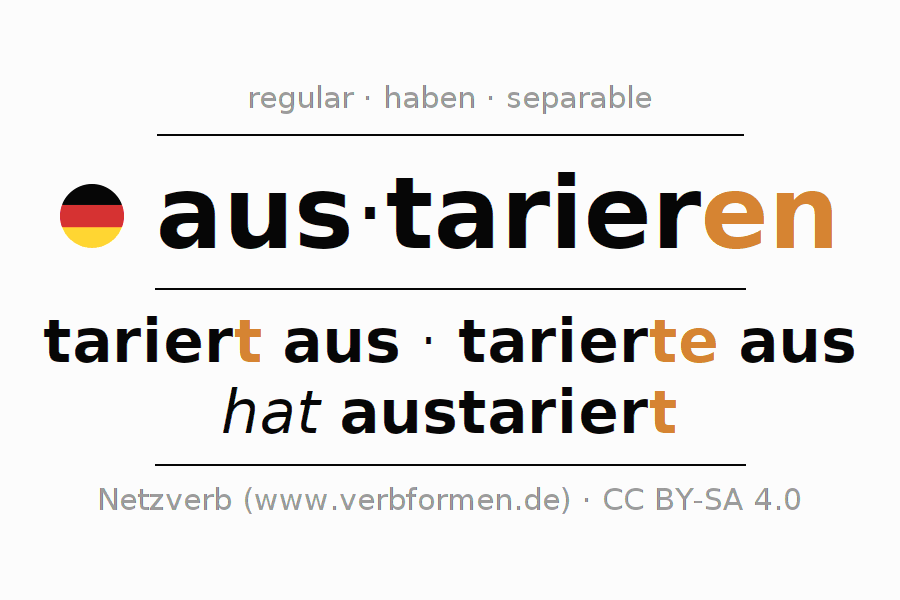 The conjugation of austarieren (balance, equalize) in the past tense is ich tarierte aus, du tariertest aus, er tarierte aus, wir tarierten aus, ihr tariertet aus, sie tarierten aus. As a regular verb the unmodified stem tarier- is used. The preterite endings -te, -test, -te, -ten, -tet, -ten are appended to this stem.The prefix aus- of austarieren is separated.The conjugation of these forms conforms to the grammatical rules for verbs in the past tense. Comments ☆