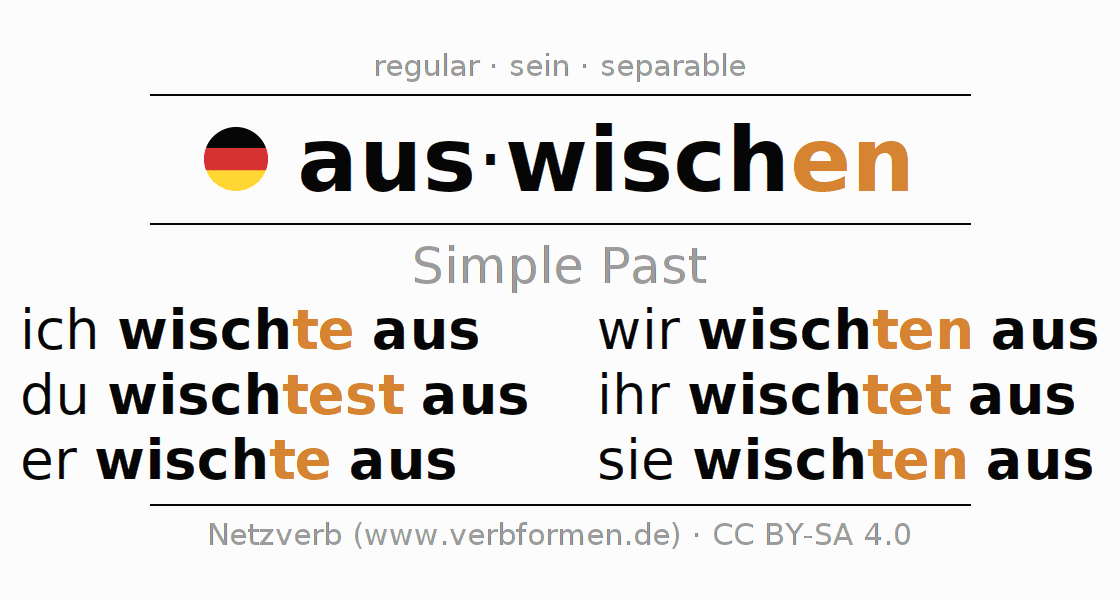 The conjugation of auswischen (escape, evade) in the past tense is ich wischte aus, du wischtest aus, er wischte aus, wir wischten aus, ihr wischtet aus, sie wischten aus. As a regular verb the unmodified stem wisch- is used. The preterite endings -te, -test, -te, -ten, -tet, -ten are appended to this stem.The prefix aus- of auswischen is separated.The conjugation of these forms conforms to the grammatical rules for verbs in the past tense. Comments ☆