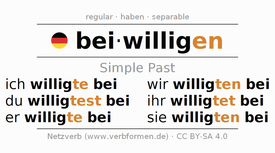 The conjugation of beiwilligen (agree (to), agree) in the past tense is ich willigte bei, du willigtest bei, er willigte bei, wir willigten bei, ihr willigtet bei, sie willigten bei. As a regular verb the unmodified stem willig- is used. The preterite endings -te, -test, -te, -ten, -tet, -ten are appended to this stem.The prefix bei- of beiwilligen is separated.The conjugation of these forms conforms to the grammatical rules for verbs in the past tense. Comments ☆