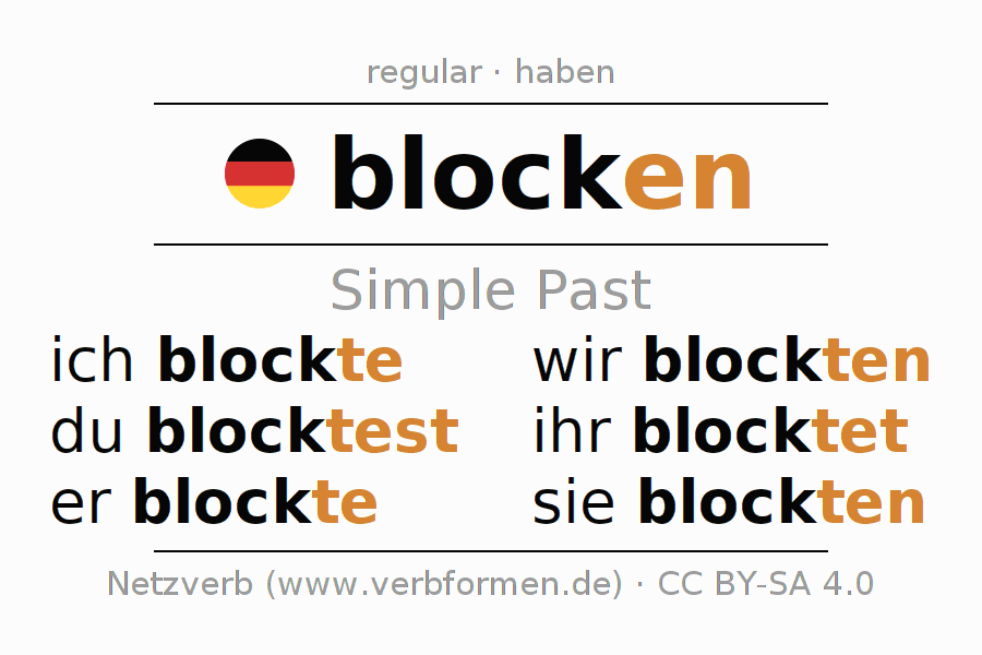 The conjugation of blocken (block, arrange) in the past tense is ich blockte, du blocktest, er blockte, wir blockten, ihr blocktet, sie blockten. As a regular verb the unmodified stem block- is used. The preterite endings -te, -test, -te, -ten, -tet, -ten are appended to this stem.The conjugation of these forms conforms to the grammatical rules for verbs in the past tense. Comments ☆