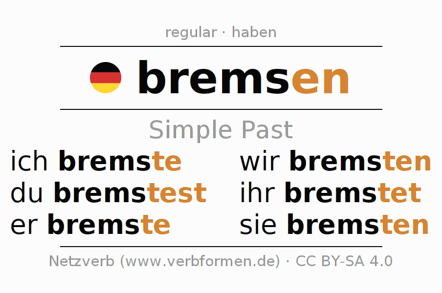 The conjugation of bremsen (slow down, brake) in the past tense is ich bremste, du bremstest, er bremste, wir bremsten, ihr bremstet, sie bremsten. As a regular verb the unmodified stem brems- is used. The preterite endings -te, -test, -te, -ten, -tet, -ten are appended to this stem.The conjugation of these forms conforms to the grammatical rules for verbs in the past tense. Comments ☆