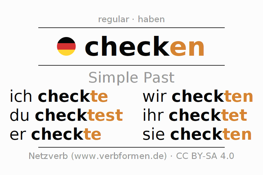 The conjugation of checken (check, bodycheck) in the past tense is ich checkte, du checktest, er checkte, wir checkten, ihr checktet, sie checkten. As a regular verb the unmodified stem check- is used. The preterite endings -te, -test, -te, -ten, -tet, -ten are appended to this stem.The conjugation of these forms conforms to the grammatical rules for verbs in the past tense. Comments ☆