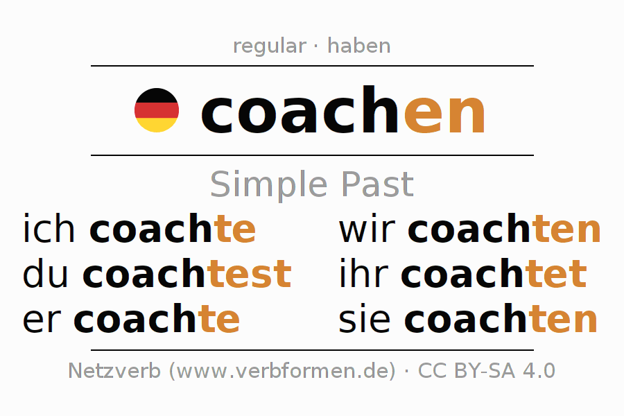 The conjugation of coachen (coach, mentor) in the past tense is ich coachte, du coachtest, er coachte, wir coachten, ihr coachtet, sie coachten. As a regular verb the unmodified stem coach- is used. The preterite endings -te, -test, -te, -ten, -tet, -ten are appended to this stem.The conjugation of these forms conforms to the grammatical rules for verbs in the past tense. Comments ☆