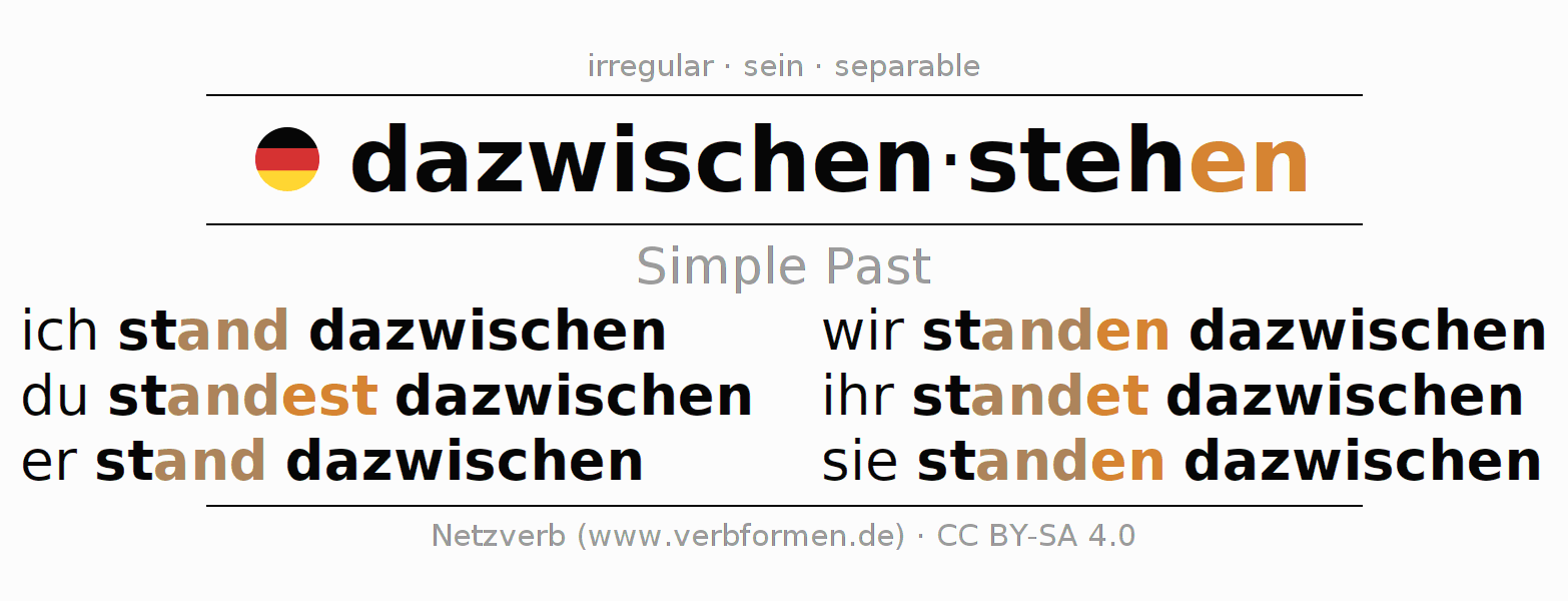 The conjugation of dazwischenstehen (interpose, intervene) in the past tense is ich stand dazwischen, du stand(e)st dazwischen, er stand dazwischen, wir standen dazwischen, ihr standet dazwischen, sie standen dazwischen. As an irregular, strong verb with ablaut -a- the preterite stem stand- is used. The preterite endings -est, -en, -et, -en are appended to this stem. The 1st and 3rd person singular have no endings.The endings of the 2nd persons are extended by "e", since the stem ends on -d.The prefix dazwischen- of dazwischenstehen is separated.The conjugation of these forms conforms to the grammatical rules for verbs in the past tense. Comments ☆