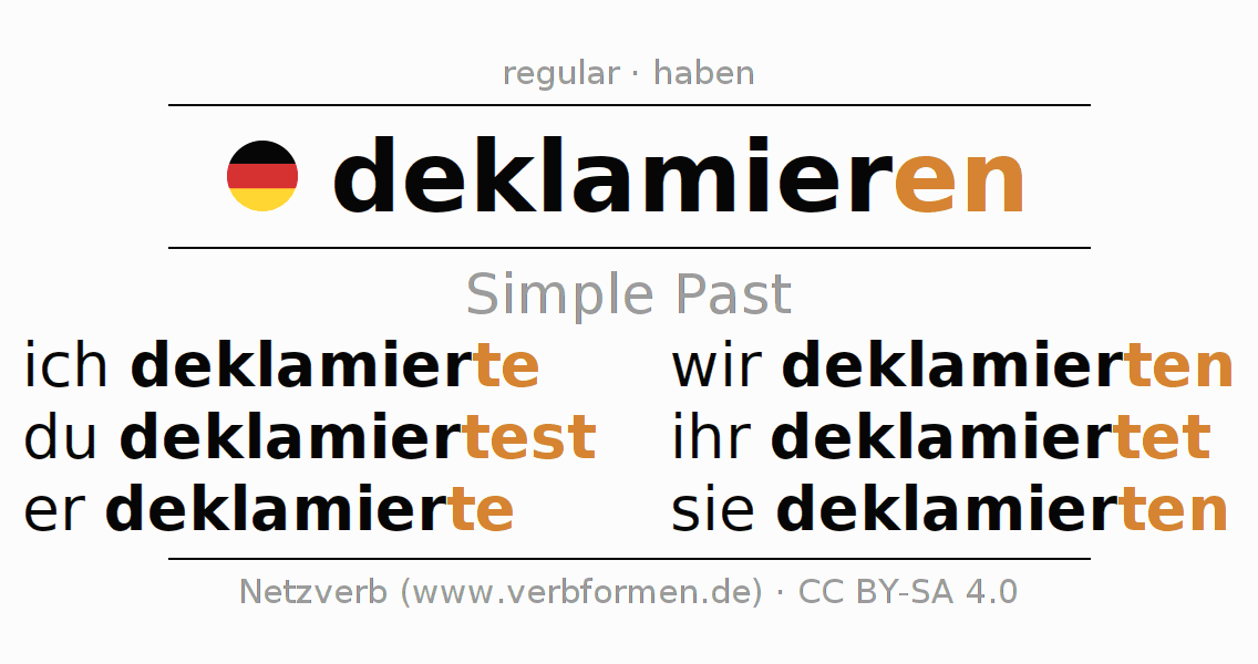 The conjugation of deklamieren (declaim, recite) in the past tense is ich deklamierte, du deklamiertest, er deklamierte, wir deklamierten, ihr deklamiertet, sie deklamierten. As a regular verb the unmodified stem deklamier- is used. The preterite endings -te, -test, -te, -ten, -tet, -ten are appended to this stem.The conjugation of these forms conforms to the grammatical rules for verbs in the past tense. Comments ☆