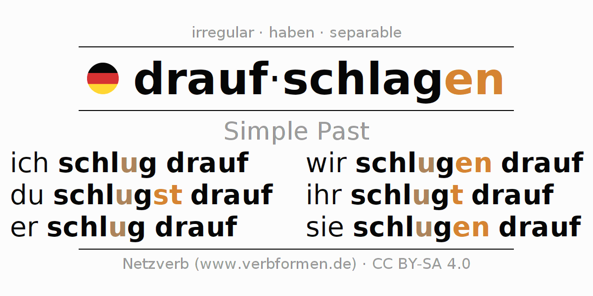 The conjugation of draufschlagen (hit, strike) in the past tense is ich schlug drauf, du schlugst drauf, er schlug drauf, wir schlugen drauf, ihr schlugt drauf, sie schlugen drauf. As an irregular, strong verb with ablaut -u- the preterite stem schlug- is used. The preterite endings -st, -en, -t, -en are appended to this stem. The 1st and 3rd person singular have no endings.The prefix drauf- of draufschlagen is separated.The conjugation of these forms conforms to the grammatical rules for verbs in the past tense. Comments ☆