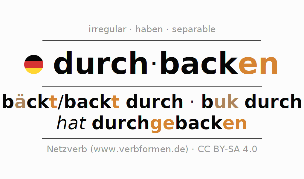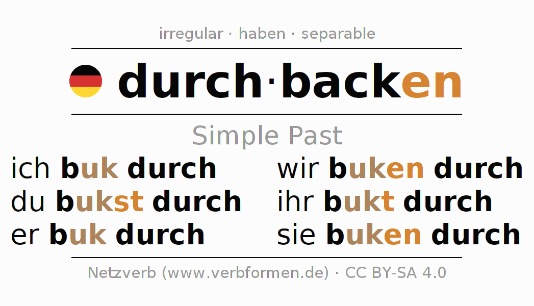 The conjugation of durchbacken (bake thoroughly, bake through) in the past tense is ich buk durch, du bukst durch, er buk durch, wir buken durch, ihr bukt durch, sie buken durch. As an irregular, strong verb with ablaut -u- the preterite stem buk- is used. The preterite endings -st, -en, -t, -en are appended to this stem. The 1st and 3rd person singular have no endings.The prefix durch- of durchbacken is separated.The conjugation of these forms conforms to the grammatical rules for verbs in the past tense. Comments ☆