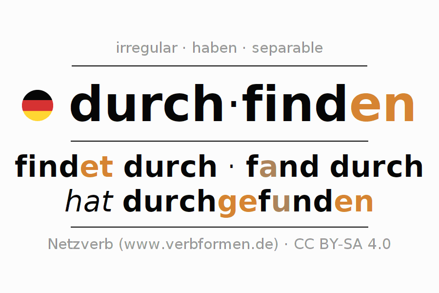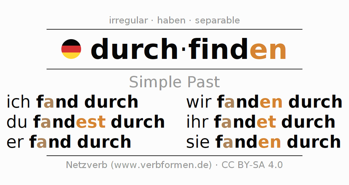 The conjugation of durchfinden (find one's way, find one's way through) in the past tense is ich fand durch, du fand(e)st durch, er fand durch, wir fanden durch, ihr fandet durch, sie fanden durch. As an irregular, strong verb with ablaut -a- the preterite stem fand- is used. The preterite endings -est, -en, -et, -en are appended to this stem. The 1st and 3rd person singular have no endings.The endings of the 2nd persons are extended by "e", since the stem ends on -d.The prefix durch- of durchfinden is separated.The conjugation of these forms conforms to the grammatical rules for verbs in the past tense. Comments ☆