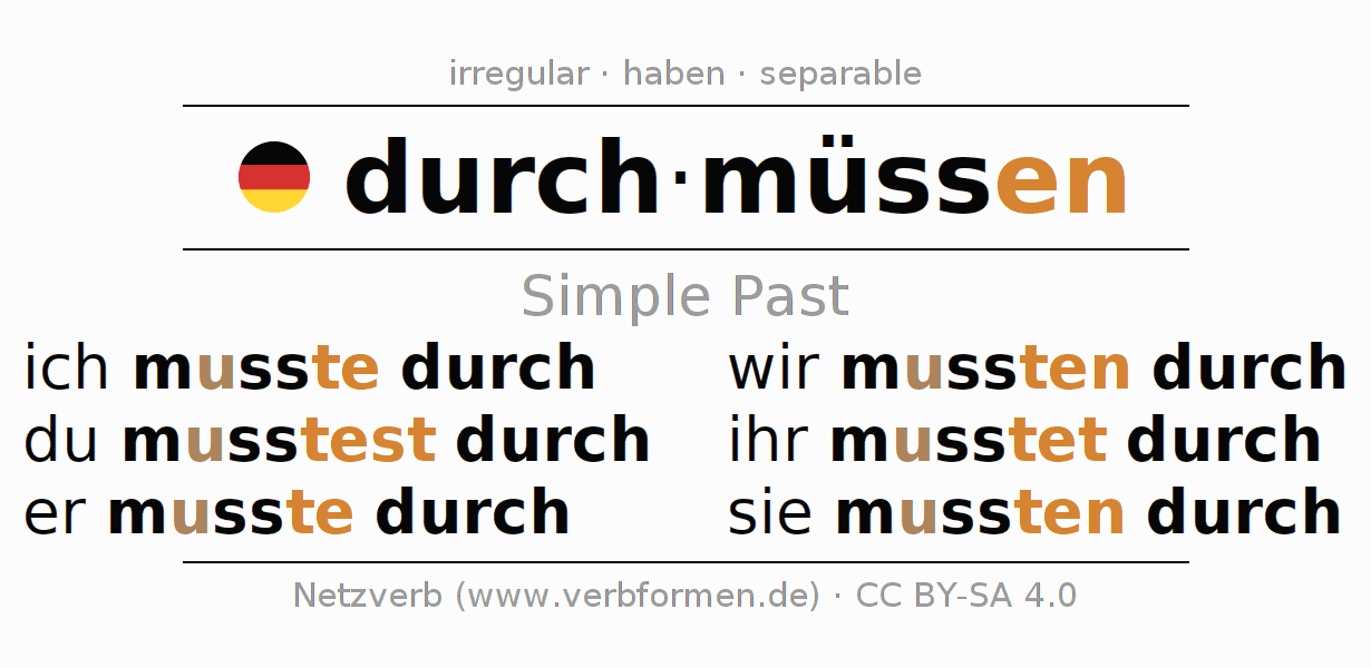 The conjugation of durchmüssen (get through, have to endure) in the past tense is ich musste durch, du musstest durch, er musste durch, wir mussten durch, ihr musstet durch, sie mussten durch. As an irregular verb is the changed preterite stem muss- used. The preterite endings -te, -test, -te, -ten, -tet, -ten are appended to this stem.The prefix durch- of durchmüssen is separated.The conjugation of these forms conforms to the grammatical rules for verbs in the past tense. Comments ☆