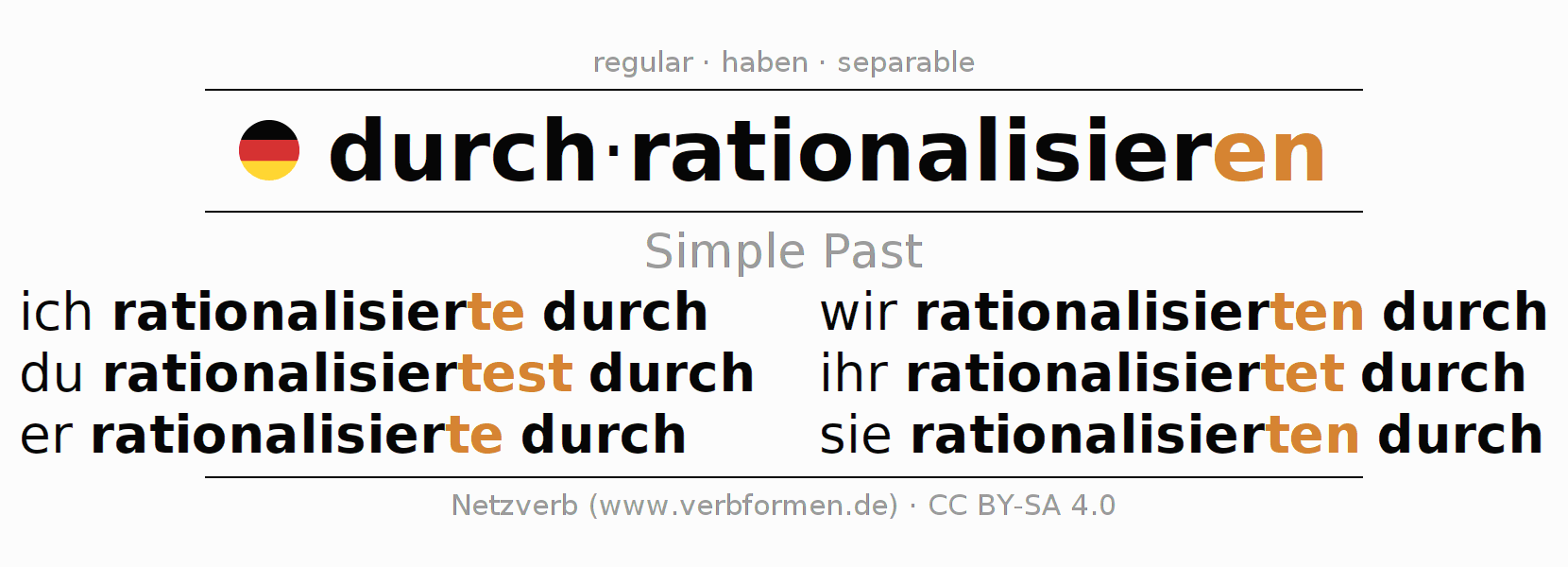 The conjugation of durchrationalisieren (streamline, rationalize) in the past tense is ich rationalisierte durch, du rationalisiertest durch, er rationalisierte durch, wir rationalisierten durch, ihr rationalisiertet durch, sie rationalisierten durch. As a regular verb the unmodified stem rationalisier- is used. The preterite endings -te, -test, -te, -ten, -tet, -ten are appended to this stem.The prefix durch- of durchrationalisieren is separated.The conjugation of these forms conforms to the grammatical rules for verbs in the past tense. Comments ☆