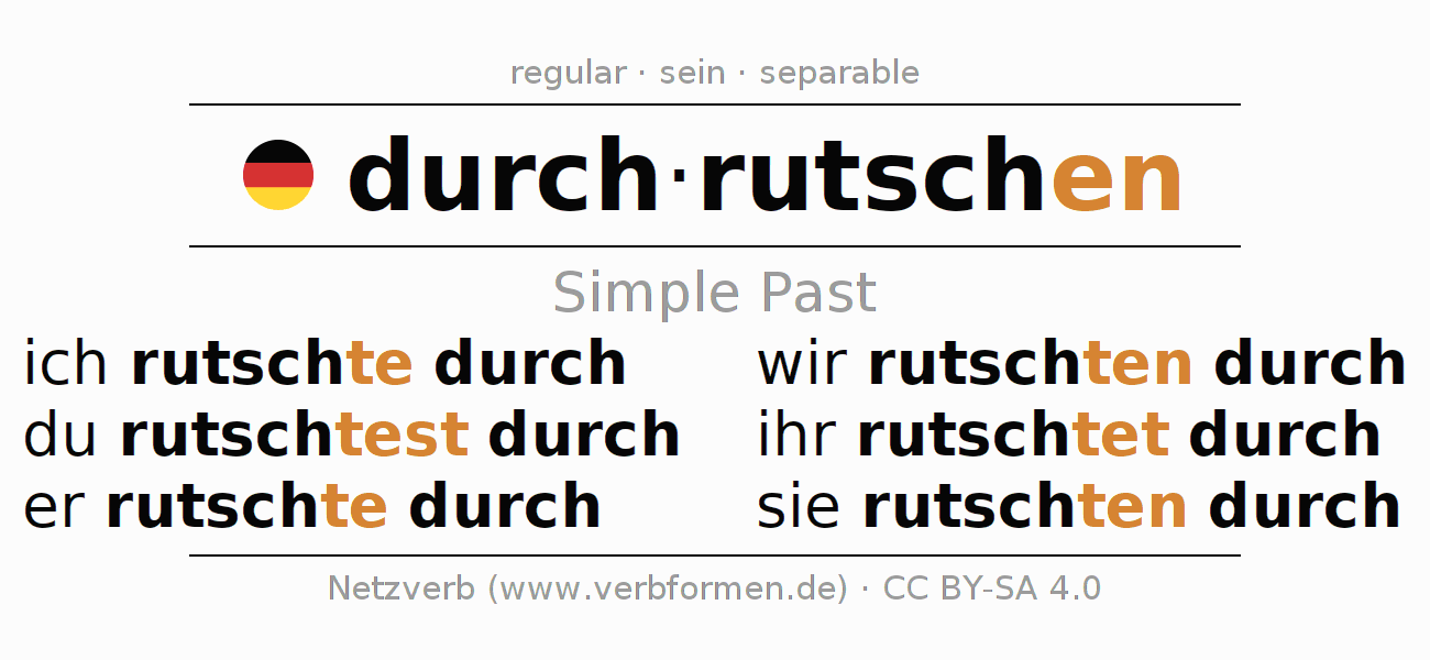 The conjugation of durchrutschen (slip through, glide through) in the past tense is ich rutschte durch, du rutschtest durch, er rutschte durch, wir rutschten durch, ihr rutschtet durch, sie rutschten durch. As a regular verb the unmodified stem rutsch- is used. The preterite endings -te, -test, -te, -ten, -tet, -ten are appended to this stem.The prefix durch- of durchrutschen is separated.The conjugation of these forms conforms to the grammatical rules for verbs in the past tense. Comments ☆