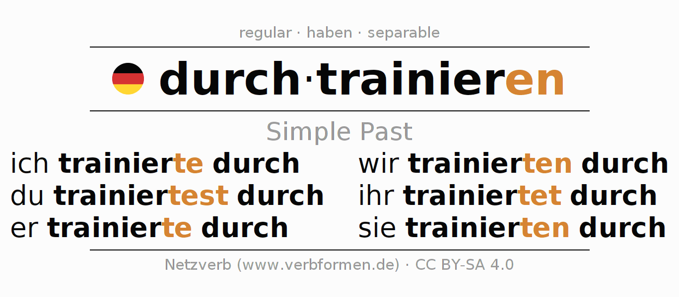 The conjugation of durchtrainieren (intensive training, train thoroughly) in the past tense is ich trainierte durch, du trainiertest durch, er trainierte durch, wir trainierten durch, ihr trainiertet durch, sie trainierten durch. As a regular verb the unmodified stem trainier- is used. The preterite endings -te, -test, -te, -ten, -tet, -ten are appended to this stem.The prefix durch- of durchtrainieren is separated.The conjugation of these forms conforms to the grammatical rules for verbs in the past tense. Comments ☆