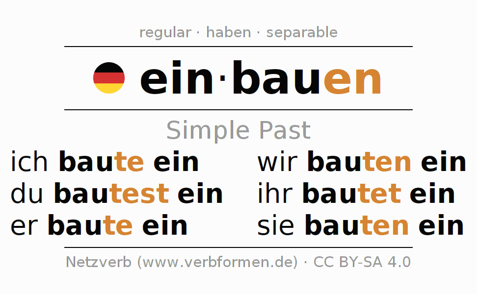 The conjugation of einbauen (install, build in) in the past tense is ich baute ein, du bautest ein, er baute ein, wir bauten ein, ihr bautet ein, sie bauten ein. As a regular verb the unmodified stem bau- is used. The preterite endings -te, -test, -te, -ten, -tet, -ten are appended to this stem.The prefix ein- of einbauen is separated.The conjugation of these forms conforms to the grammatical rules for verbs in the past tense. Comments ☆