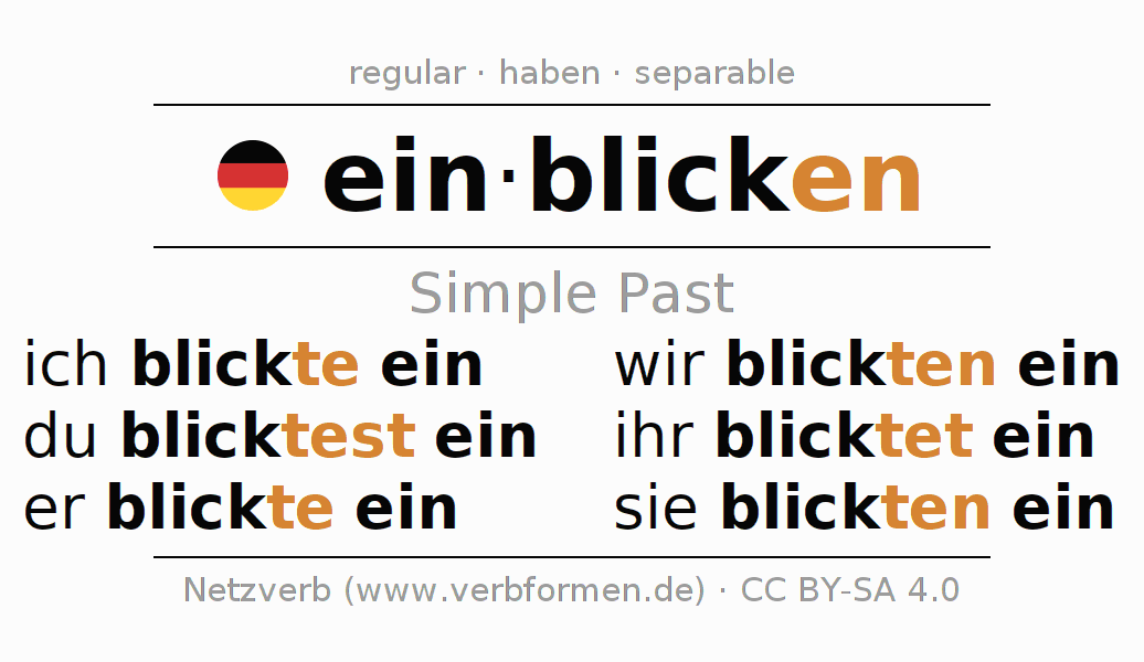 The conjugation of einblicken (glimpse, look) in the past tense is ich blickte ein, du blicktest ein, er blickte ein, wir blickten ein, ihr blicktet ein, sie blickten ein. As a regular verb the unmodified stem blick- is used. The preterite endings -te, -test, -te, -ten, -tet, -ten are appended to this stem.The prefix ein- of einblicken is separated.The conjugation of these forms conforms to the grammatical rules for verbs in the past tense. Comments ☆