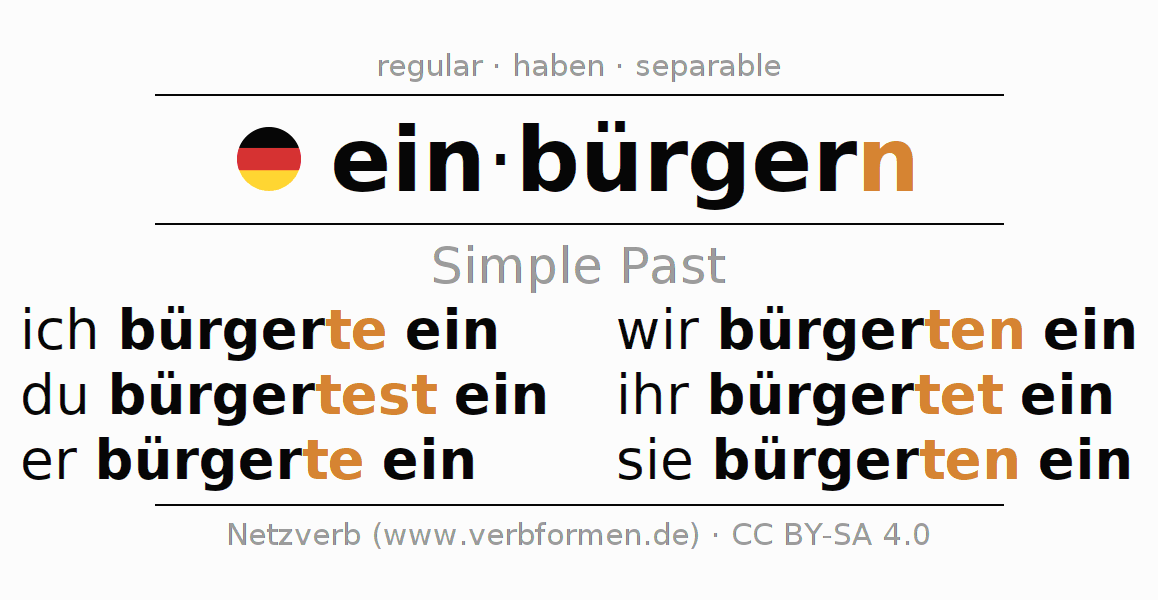 The conjugation of einbürgern (naturalize, naturalise) in the past tense is ich bürgerte ein, du bürgertest ein, er bürgerte ein, wir bürgerten ein, ihr bürgertet ein, sie bürgerten ein. As a regular verb the unmodified stem bürger- is used. The preterite endings -te, -test, -te, -ten, -tet, -ten are appended to this stem.The prefix ein- of einbürgern is separated.The conjugation of these forms conforms to the grammatical rules for verbs in the past tense. Comments ☆