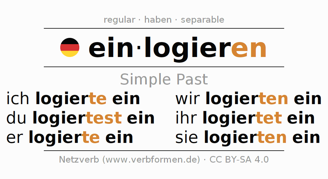 The conjugation of einlogieren (accommodate, stay) in the past tense is ich logierte ein, du logiertest ein, er logierte ein, wir logierten ein, ihr logiertet ein, sie logierten ein. As a regular verb the unmodified stem logier- is used. The preterite endings -te, -test, -te, -ten, -tet, -ten are appended to this stem.The prefix ein- of einlogieren is separated.The conjugation of these forms conforms to the grammatical rules for verbs in the past tense. Comments ☆