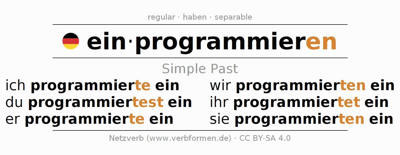 The conjugation of einprogrammieren (program, input program) in the past tense is ich programmierte ein, du programmiertest ein, er programmierte ein, wir programmierten ein, ihr programmiertet ein, sie programmierten ein. As a regular verb the unmodified stem programmier- is used. The preterite endings -te, -test, -te, -ten, -tet, -ten are appended to this stem.The prefix ein- of einprogrammieren is separated.The conjugation of these forms conforms to the grammatical rules for verbs in the past tense. Comments ☆