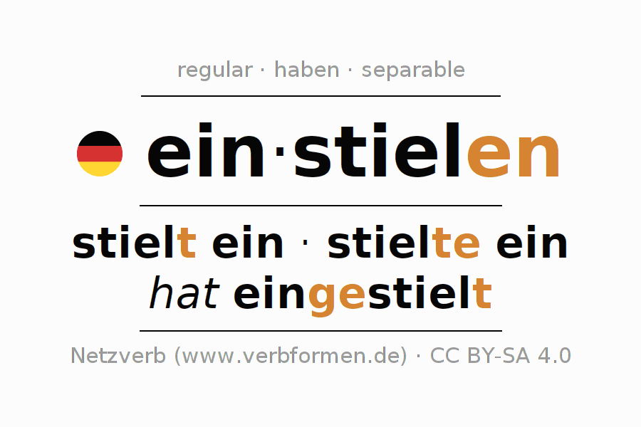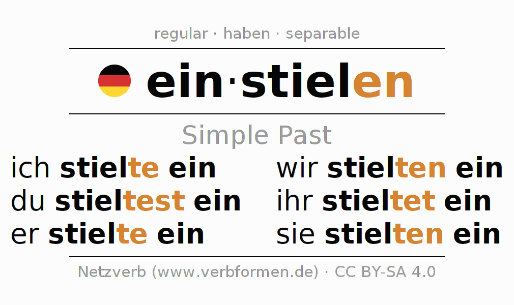 The conjugation of einstielen (arrange, organize) in the past tense is ich stielte ein, du stieltest ein, er stielte ein, wir stielten ein, ihr stieltet ein, sie stielten ein. As a regular verb the unmodified stem stiel- is used. The preterite endings -te, -test, -te, -ten, -tet, -ten are appended to this stem.The prefix ein- of einstielen is separated.The conjugation of these forms conforms to the grammatical rules for verbs in the past tense. Comments ☆