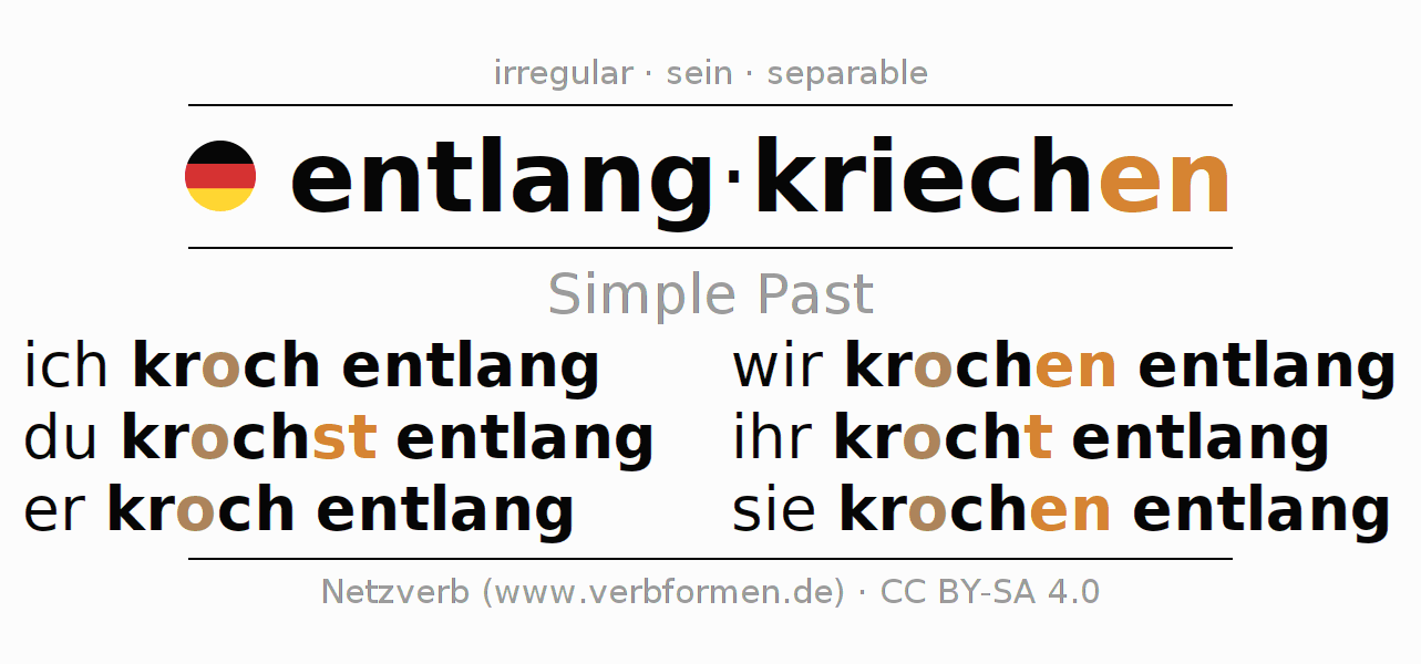 The conjugation of entlangkriechen (crawl along, creep along) in the past tense is ich kroch entlang, du krochst entlang, er kroch entlang, wir krochen entlang, ihr krocht entlang, sie krochen entlang. As an irregular, strong verb with ablaut -o- the preterite stem kroch- is used. The preterite endings -st, -en, -t, -en are appended to this stem. The 1st and 3rd person singular have no endings.The prefix entlang- of entlangkriechen is separated.The conjugation of these forms conforms to the grammatical rules for verbs in the past tense. Comments ☆