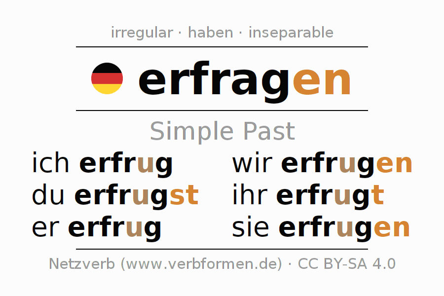 The conjugation of erfragen (ask, ask for information) in the past tense is ich erfrug, du erfrugst, er erfrug, wir erfrugen, ihr erfrugt, sie erfrugen. As an irregular, strong verb with ablaut -u- the preterite stem frug- is used. The preterite endings -st, -en, -t, -en are appended to this stem. The 1st and 3rd person singular have no endings.The conjugation of these forms conforms to the grammatical rules for verbs in the past tense. Comments ☆