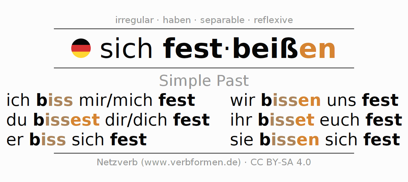 The conjugation of sich festbeißen (bite down, clamp down) in the past tense is ich biss mir/mich fest, du biss(es)t dir/dich fest, er biss sich fest, wir bissen uns fest, ihr biss(e)t euch fest, sie bissen sich fest. As an irregular, strong verb with ablaut -i- the preterite stem biss- is used. The preterite endings -est, -en, -et, -en are appended to this stem. The 1st and 3rd person singular have no endings.The endings of the 2nd persons are extended by "e", since the stem ends on -s.The prefix fest- of sich festbeißen is separated.The conjugation of these forms conforms to the grammatical rules for verbs in the past tense. Comments ☆