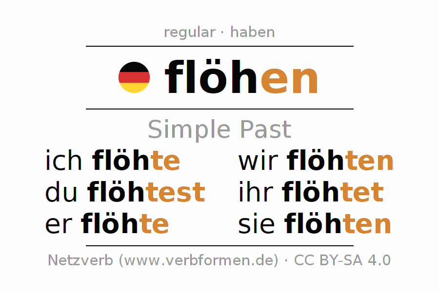 The conjugation of flöhen (get rid (of) fleas, flea) in the past tense is ich flöhte, du flöhtest, er flöhte, wir flöhten, ihr flöhtet, sie flöhten. As a regular verb the unmodified stem flöh- is used. The preterite endings -te, -test, -te, -ten, -tet, -ten are appended to this stem.The conjugation of these forms conforms to the grammatical rules for verbs in the past tense. Comments ☆