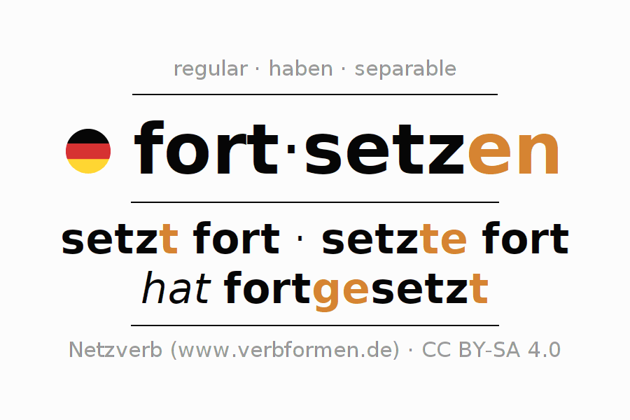 The conjugation of fortsetzen (continue, carry on) in the past tense is ich setzte fort, du setztest fort, er setzte fort, wir setzten fort, ihr setztet fort, sie setzten fort. As a regular verb the unmodified stem setz- is used. The preterite endings -te, -test, -te, -ten, -tet, -ten are appended to this stem.The prefix fort- of fortsetzen is separated.The conjugation of these forms conforms to the grammatical rules for verbs in the past tense. Comments ☆