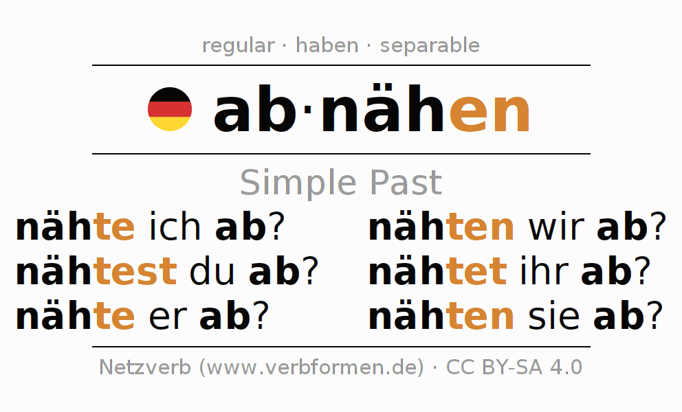 The conjugation of abnähen in Imperfect Indicative Past Active is nähte ich ab?, nähtest du ab?, nähte er ab?, nähten wir ab?, nähtet ihr ab?, nähten sie ab?.The conjugation corresponds to certain grammatical rules. Likewise the requirements for the conjugation of the simple verb forms of abnähen in Imperfect. Comments ☆