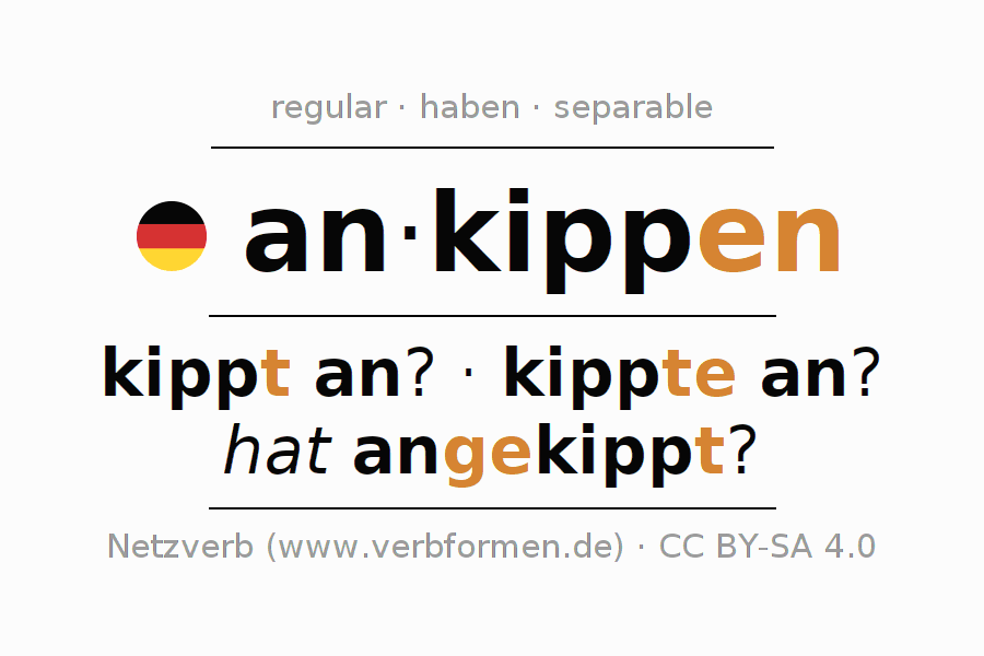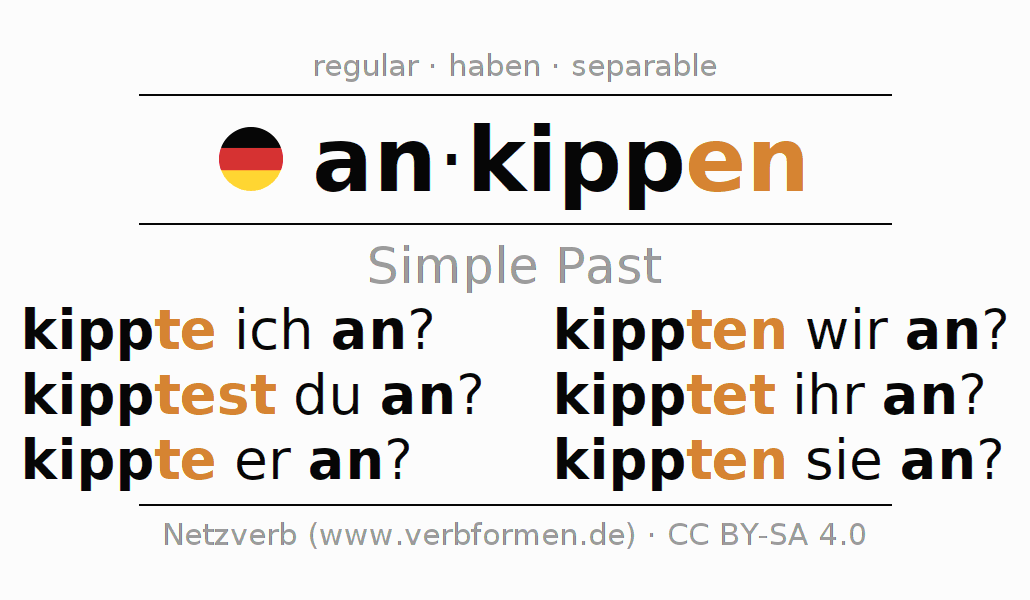 The conjugation of ankippen in Imperfect Indicative Past Active is kippte ich an?, kipptest du an?, kippte er an?, kippten wir an?, kipptet ihr an?, kippten sie an?.The conjugation corresponds to certain grammatical rules. Likewise the requirements for the conjugation of the simple verb forms of ankippen in Imperfect. Comments ☆