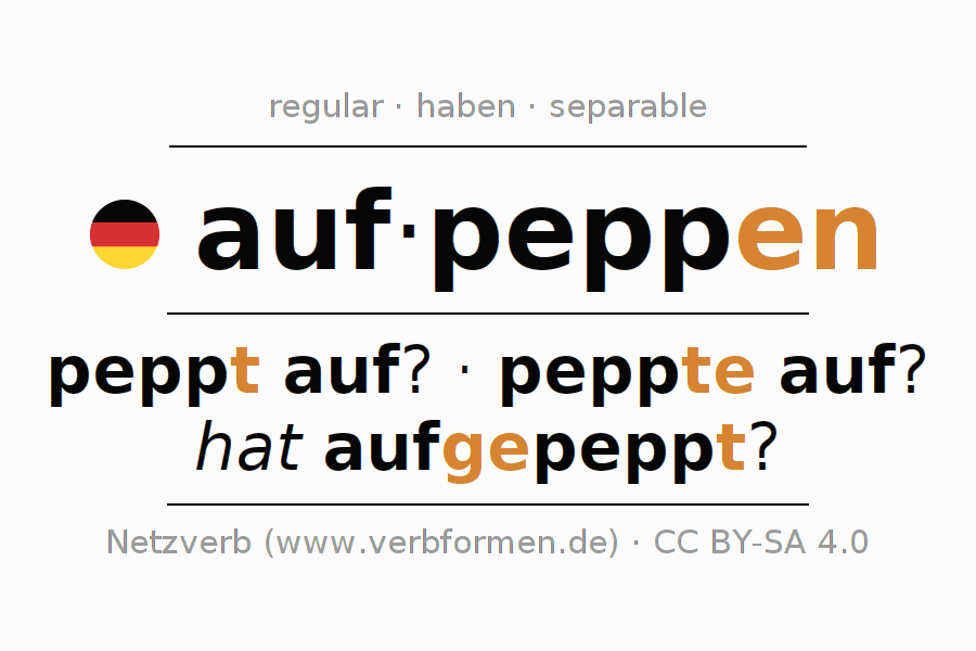 The conjugation of aufpeppen in Imperfect Indicative Past Active is peppte ich auf?, pepptest du auf?, peppte er auf?, peppten wir auf?, pepptet ihr auf?, peppten sie auf?.The conjugation corresponds to certain grammatical rules. Likewise the requirements for the conjugation of the simple verb forms of aufpeppen in Imperfect. Comments ☆