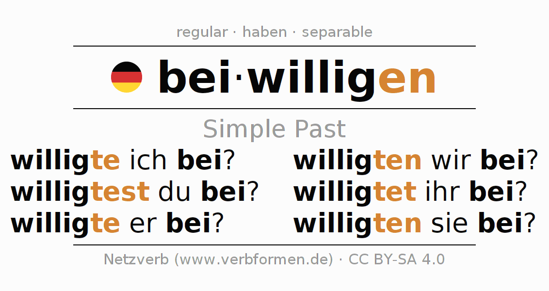 The conjugation of beiwilligen in Imperfect Indicative Past Active is willigte ich bei?, willigtest du bei?, willigte er bei?, willigten wir bei?, willigtet ihr bei?, willigten sie bei?.The conjugation corresponds to certain grammatical rules. Likewise the requirements for the conjugation of the simple verb forms of beiwilligen in Imperfect. Comments ☆