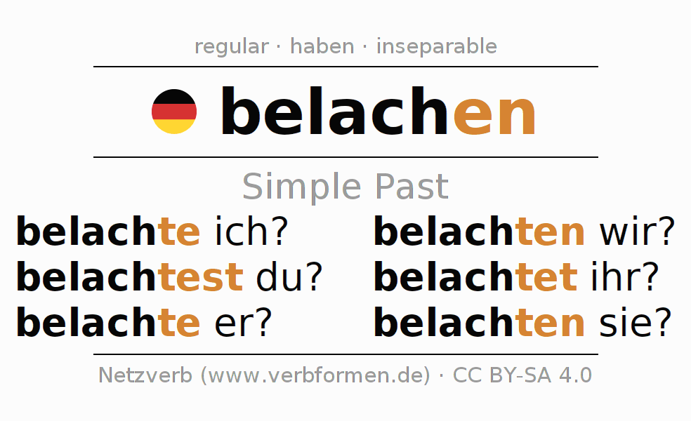 The conjugation of belachen in Imperfect Indicative Past Active is belachte ich?, belachtest du?, belachte er?, belachten wir?, belachtet ihr?, belachten sie?.The conjugation corresponds to certain grammatical rules. Likewise the requirements for the conjugation of the simple verb forms of belachen in Imperfect. Comments ☆