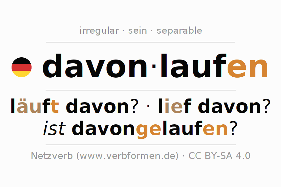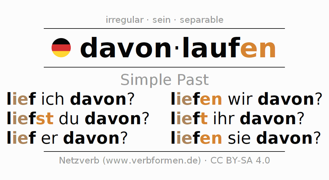 The conjugation of davonlaufen in Imperfect Indicative Past Active is lief ich davon?, liefst du davon?, lief er davon?, liefen wir davon?, lieft ihr davon?, liefen sie davon?.The conjugation corresponds to certain grammatical rules. Likewise the requirements for the conjugation of the simple verb forms of davonlaufen in Imperfect. Comments ☆