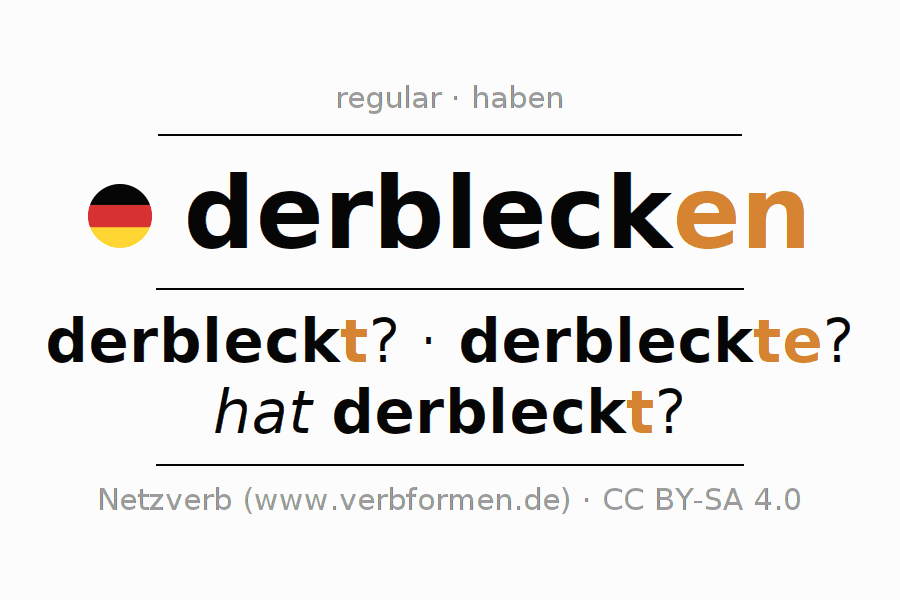 The conjugation of derblecken in Imperfect Indicative Past Active is derbleckte ich?, derblecktest du?, derbleckte er?, derbleckten wir?, derblecktet ihr?, derbleckten sie?.The conjugation corresponds to certain grammatical rules. Likewise the requirements for the conjugation of the simple verb forms of derblecken in Imperfect. Comments ☆