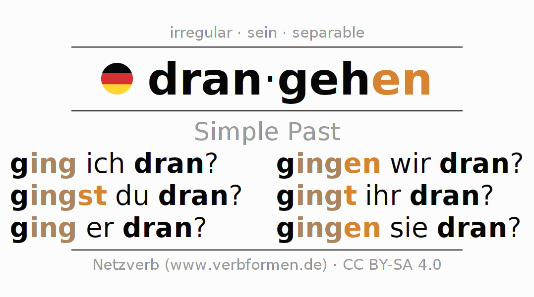 The conjugation of drangehen in Imperfect Indicative Past Active is ging ich dran?, gingst du dran?, ging er dran?, gingen wir dran?, gingt ihr dran?, gingen sie dran?.The conjugation corresponds to certain grammatical rules. Likewise the requirements for the conjugation of the simple verb forms of drangehen in Imperfect. Comments ☆